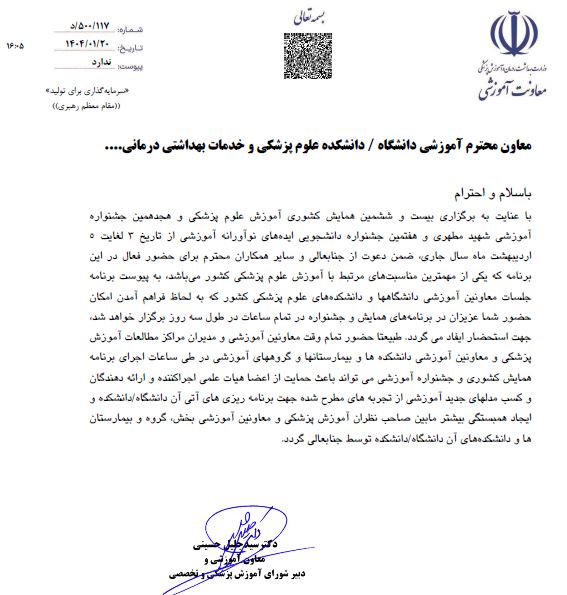 اعلام برنامه نشست معاونین آموزشی دانشگاهها در همایش آموزش پزشکی و جشنواره شهید مطهری سوم لغایت پنجم اردیبهشت ماه 1404