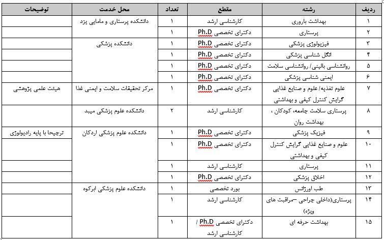 با توجه به مجوز هیات اجرایی جذب، دانشگاه علوم پزشکی شهید صدوقی یزد جهت تامین نیاز هیات علمی آموزشی، از بین فارغ التحصیلان رشته های ذیل جهت انجام تعهدات قانونی در قالب هیات علمی، دعوت به همکاری می نماید. واجدین شرایط می توانند از تاریخ فراخوان به مدت 15 روز، درخواست، رزومه و مدارک شناسایی خود را به همراه فرم شماره1 تکمیل شده به دانشگاه علوم پزشکی شهید صدوقی یزد - معاونت آموزشی - مرکز امور هیات علمی تحویل داده یا به آدرس ایمیل education@ssu.ac.ir ارسال کنند.