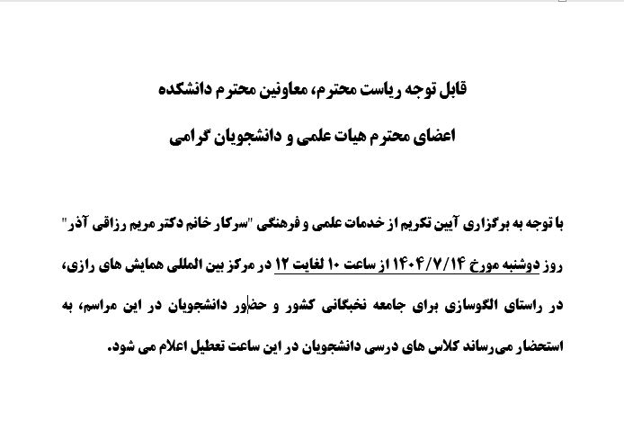 اعلام تعطیلی کلاس های درسی دانشجویان روز دوشنبه ساعت 10 لغایت 12 در مجموعه پردیس دانشگاه